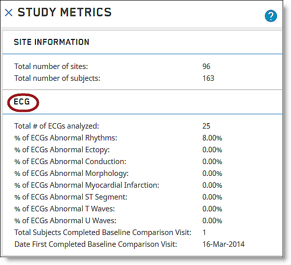 A new Study Metrics window displays, providing the ECG data pertaining to the study, as well as total number of sites and subjects.