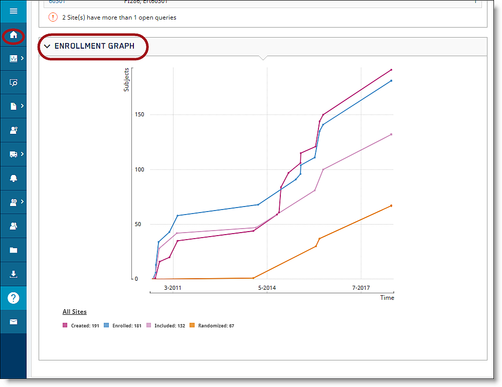 The Enrollment Graph widget does not show for every type of study; It displays only for eCOA Phone/Web and PFT studies at this time. |